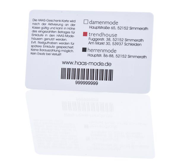 Barcodes können auch auf Plastikkarten aufgedruckt werden und dienen zur Personalisierung ihrer Kundenkarte oder Gutscheinkarte: Auf Barcode-Karten können Nummernfolgen wie z.B. die Kundennummer auf Kundenkarten oder die Artikelnummer in einem Strichcode verschlüsselt werden. Die persönlichen Daten Ihrer Kunden bleiben durch den Barcode im Gegensatz zur sichtbaren Personalisierung anonym und beeinträchtigen das Design ihrer Gutscheinkarte oder Kundenkarte nicht.