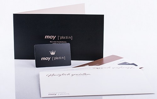 Die Sets "May Gold" und "May Platin" kommen jeweils in einheitlichem Look daher mit den farblich abgestimmten Komponenten Verpackung, Anschreiben und Booklet. Mit der Karte profitieren die May-Kunden in den Modehäusern von etlichen exklusiven Vorteilen.