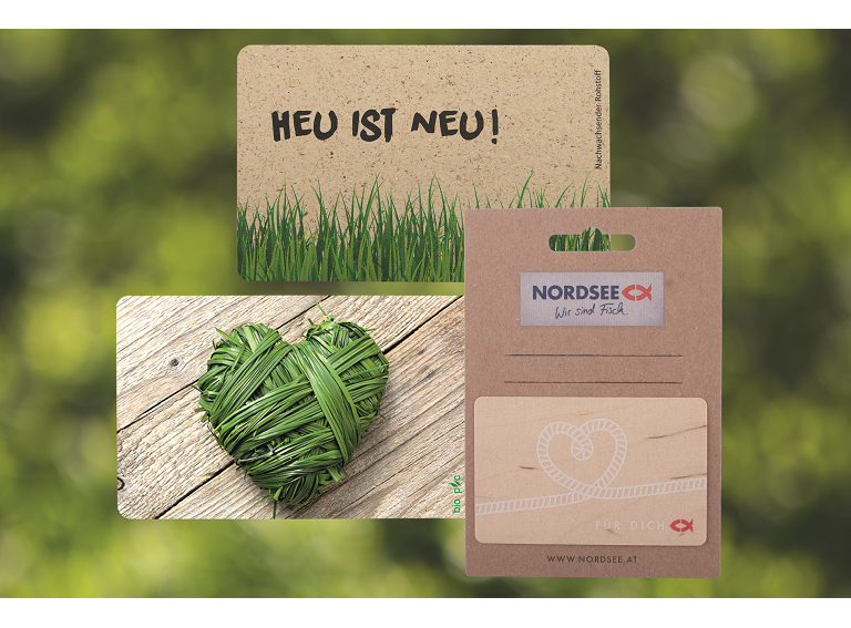 Besides from wood and grass, cards are also made from other natural materials such as sugar cane or ginkgo. Thinner and lighter than PVC cards, they are nevertheless stable and can be printed with colours. The big advantage is that the cards are recyclable, biodegradable, and compostable.
