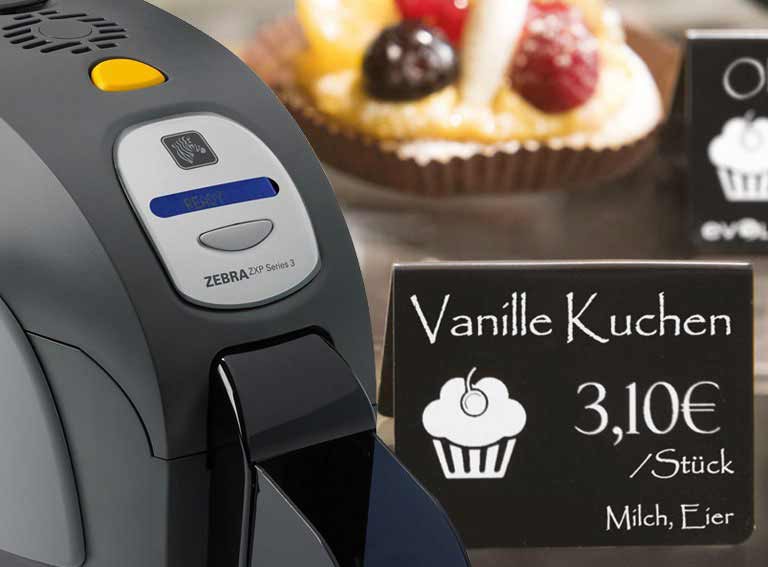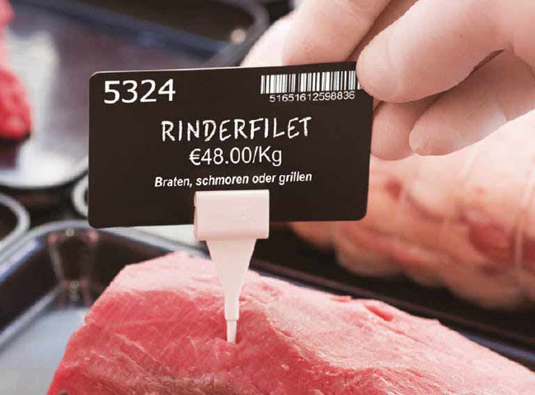 There are practically no limits to the design of your printed price tags! Because with our high-quality thermal transfer card printers you can have your price tags printed without a border in your desired design. We will be happy to advise you on the optimum design of your plastic cards printed as price tags, especially when it comes to labelling food in a fresh food counter such as baked goods, meat, sausage, cheese or fish. Our ISO-standardised plastic price tags meet hygiene standards and, with lamination, do not provide a breeding ground for germs and can be cleaned within a few seconds. At the same time, the printed plastic price tags are also resistant to harmful environmental influences and have the right size, even in special formats, depending on requirements.