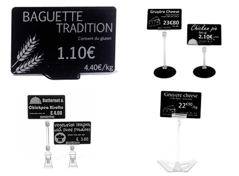 Our assortment also includes various types of holders and displays for price tags on counters and shelves. These holders are designed for standard shelves, but we also offer holders and stands for special price tag sizes. Whether narrow or wide, magnetic, to set up or insert, to combine 2 price tag cards, adapted to your business (butchery, bakery, fish counter, delicatessen, bistro, etc.).